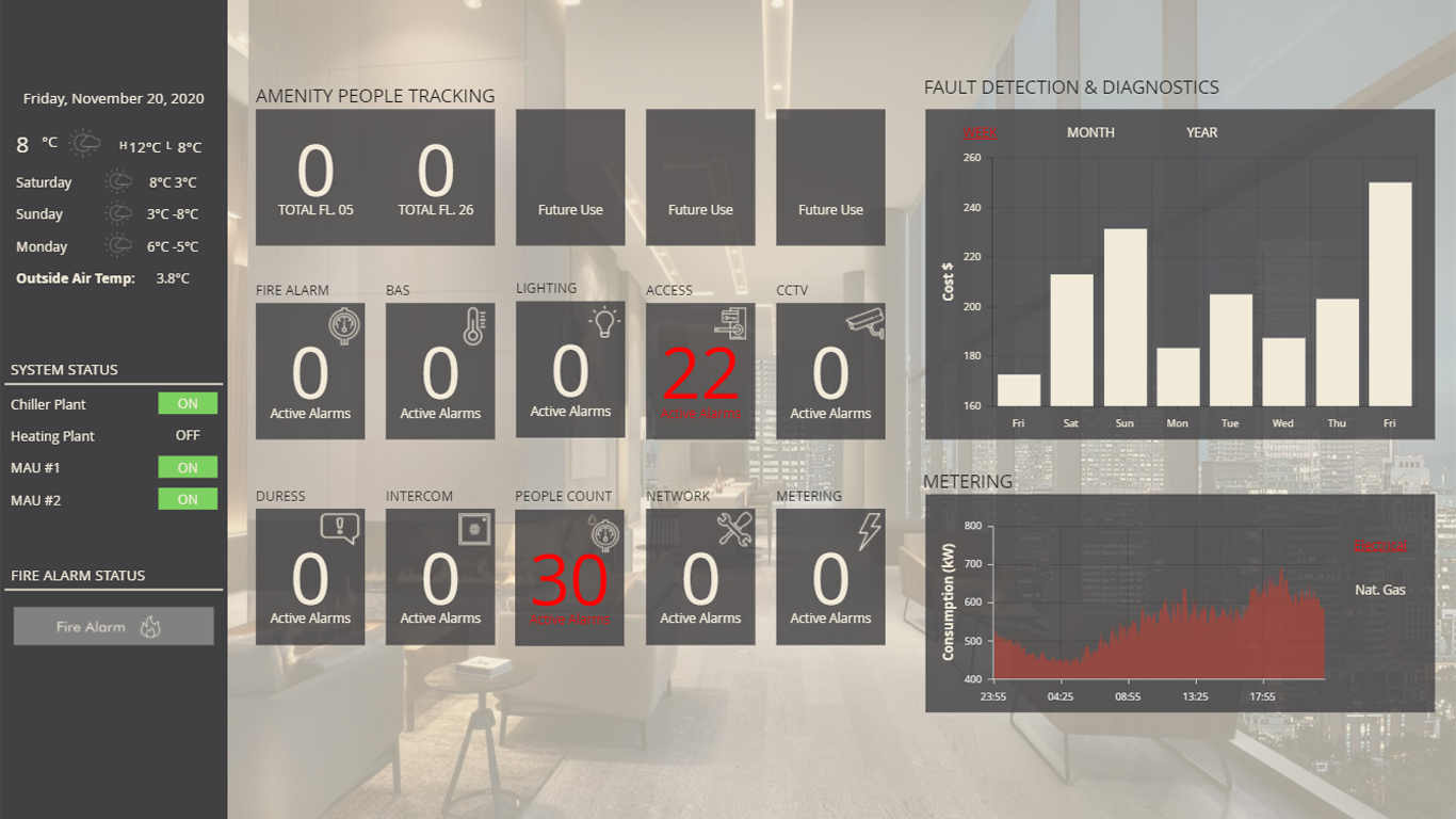 In addition to integration and analytics, we also use FINstack to create consolidated dashboards, 3D floor graphics and system graphics for building operators